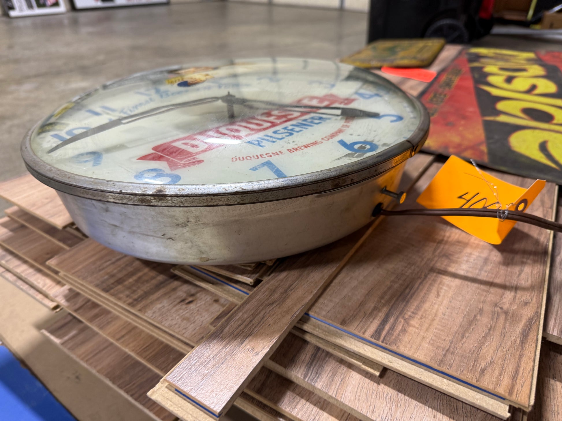 Duquesne Advertising Clock Lights up with painted glass and Glass Bubble Front. Made by PAM CLCOK CO and measures approximately 15 inches in Diameter.