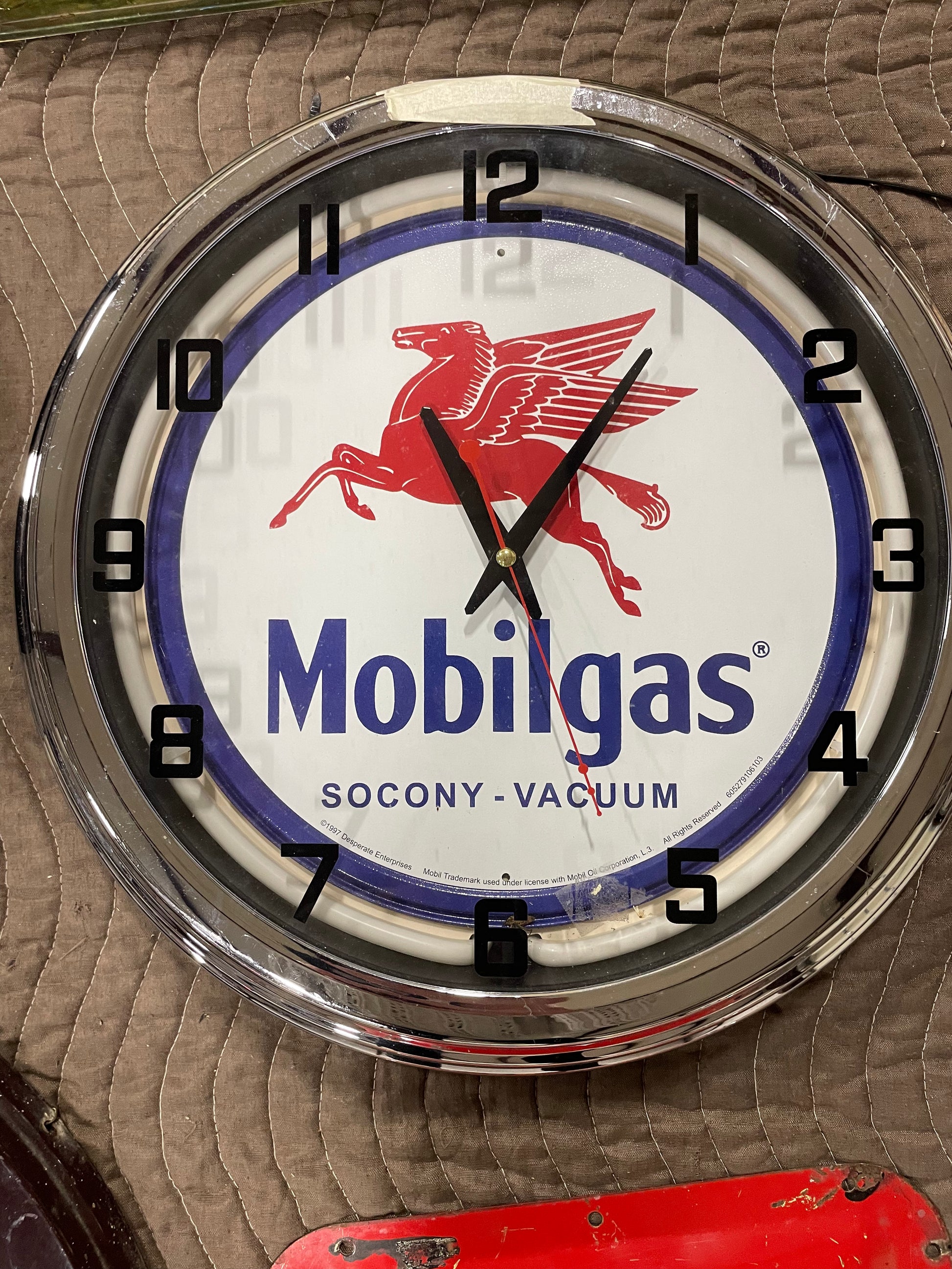 Neon Clock Features MobilGas Pegasus and reads "Socony - Vacuum". Clock Measures approximately 16" round and has a plug to light neon