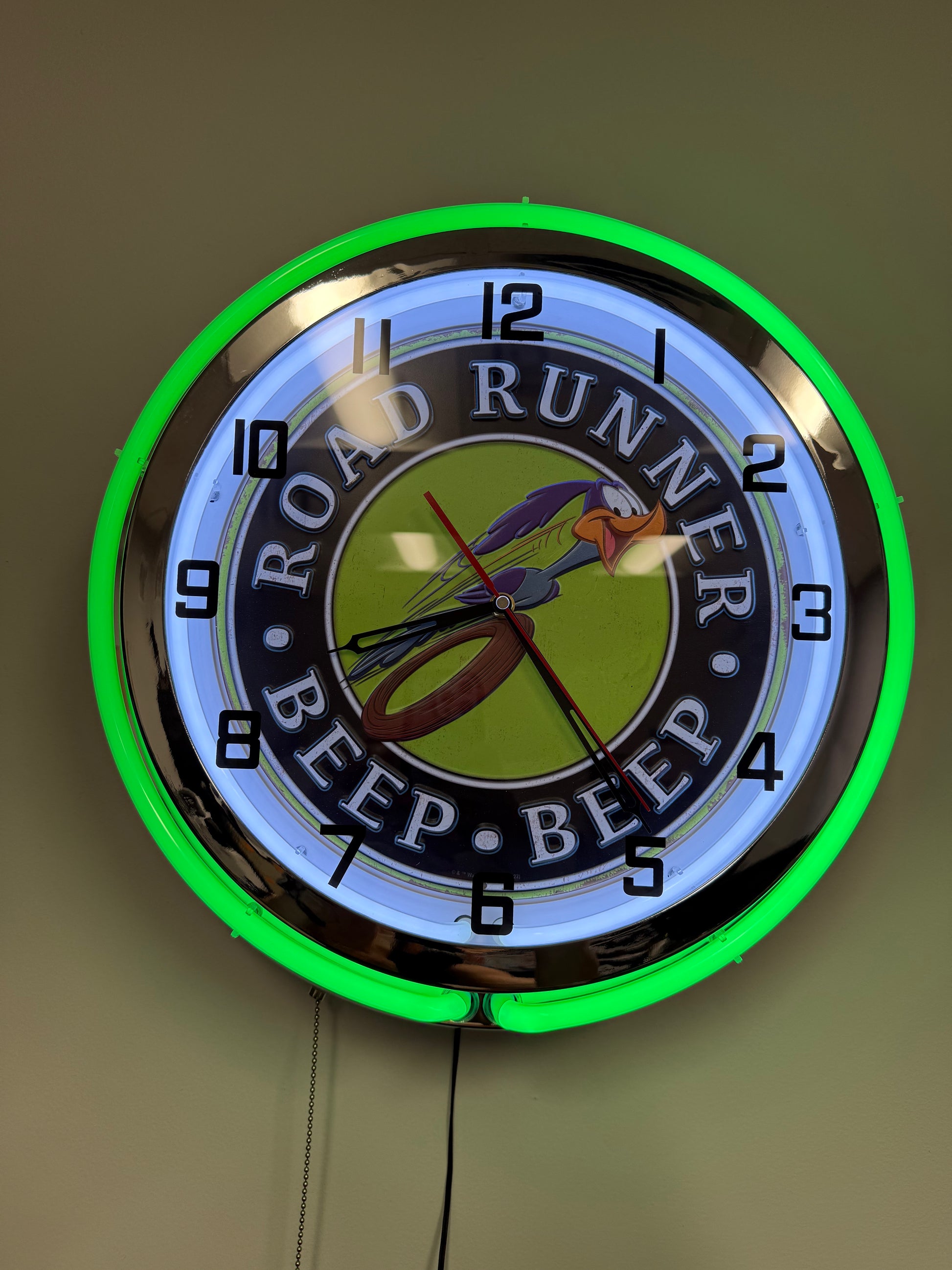 Road Runner Neon Clock Face features The Looney Tunes Road Runner. Face is surrounded by Green Neon and measures approximately 15" Round. Clock base is Chrome.