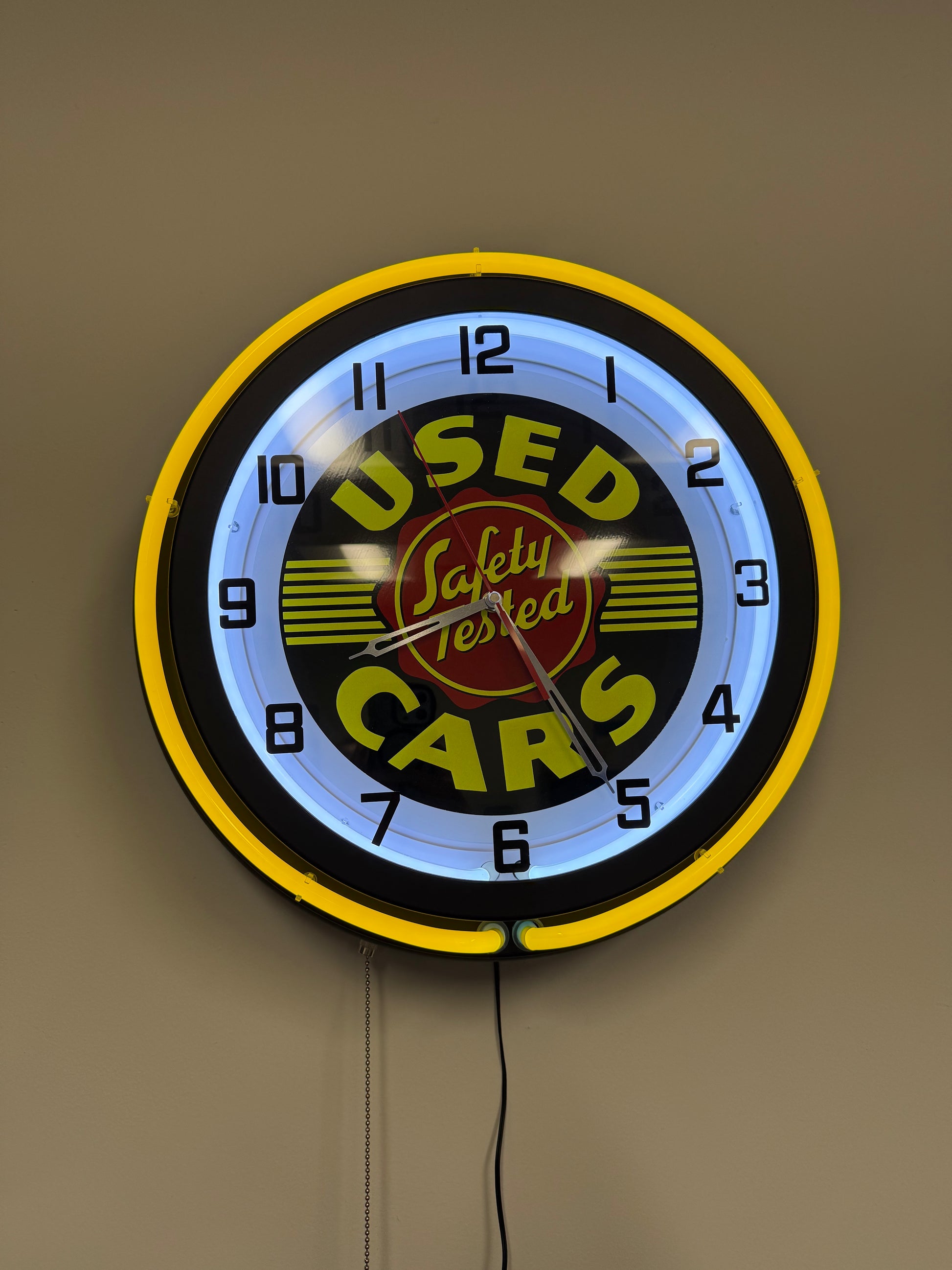 Safety Tested Used Cars Neon Clock. Face is surrounded by Yellow Neon and measures approximately 15" Round. Clock base is Black Graphite.