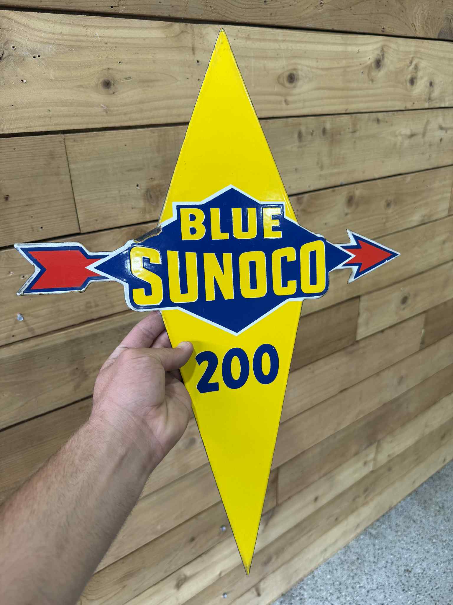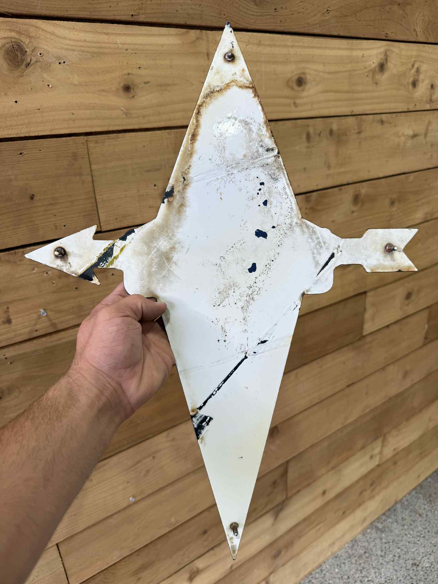 Single sided porcelain pump plate measures approximately 21 inches tall by 15 inches wide has mounted screws on back for hanging